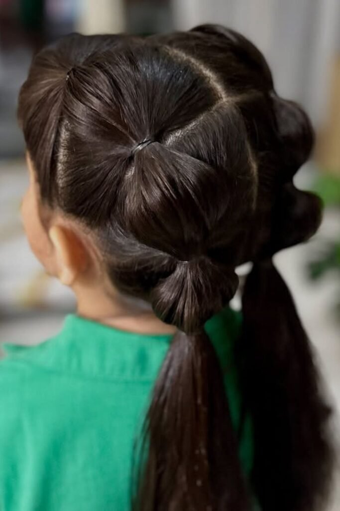 Bubble-puff pigtails make mornings more fun because the sections keep the style in place even on busy school days.