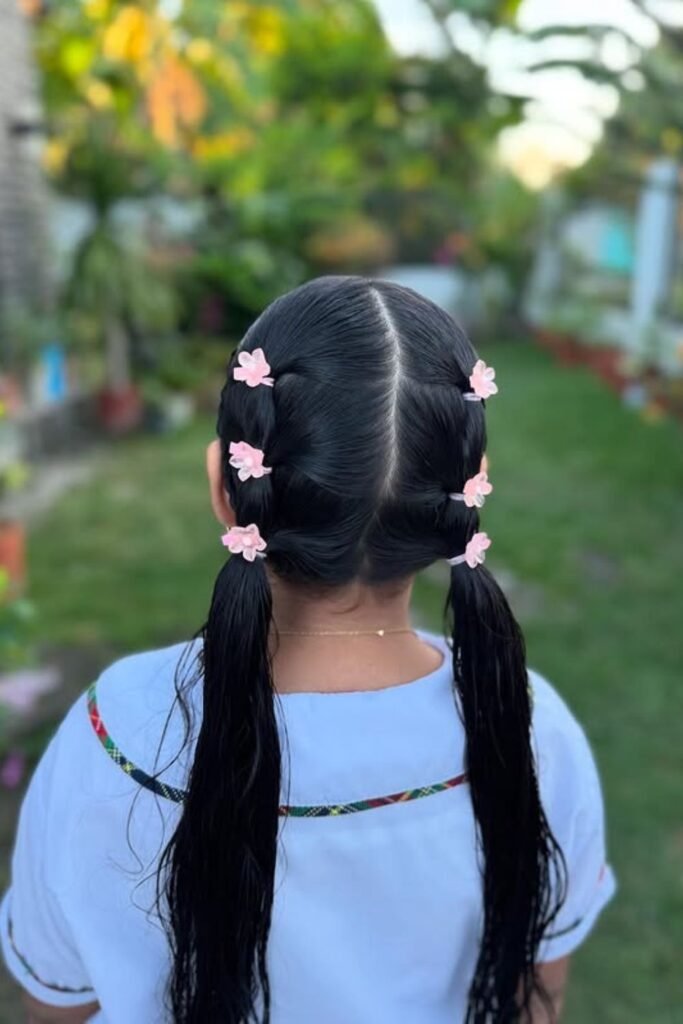 Fresh mornings feel easier with twin ponytails because they keep the hair off the face and stay neat through an active school day.
