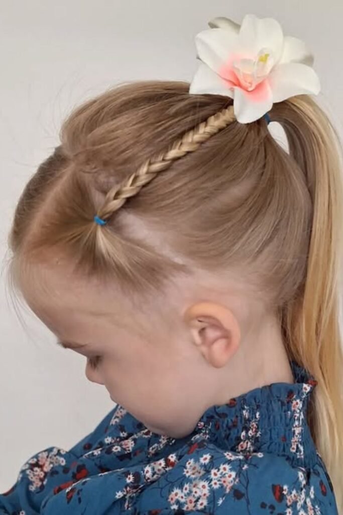 This approach works nicely for straight or long hair since the structure keeps the pony neat all day at school and keeps flyaways in check.