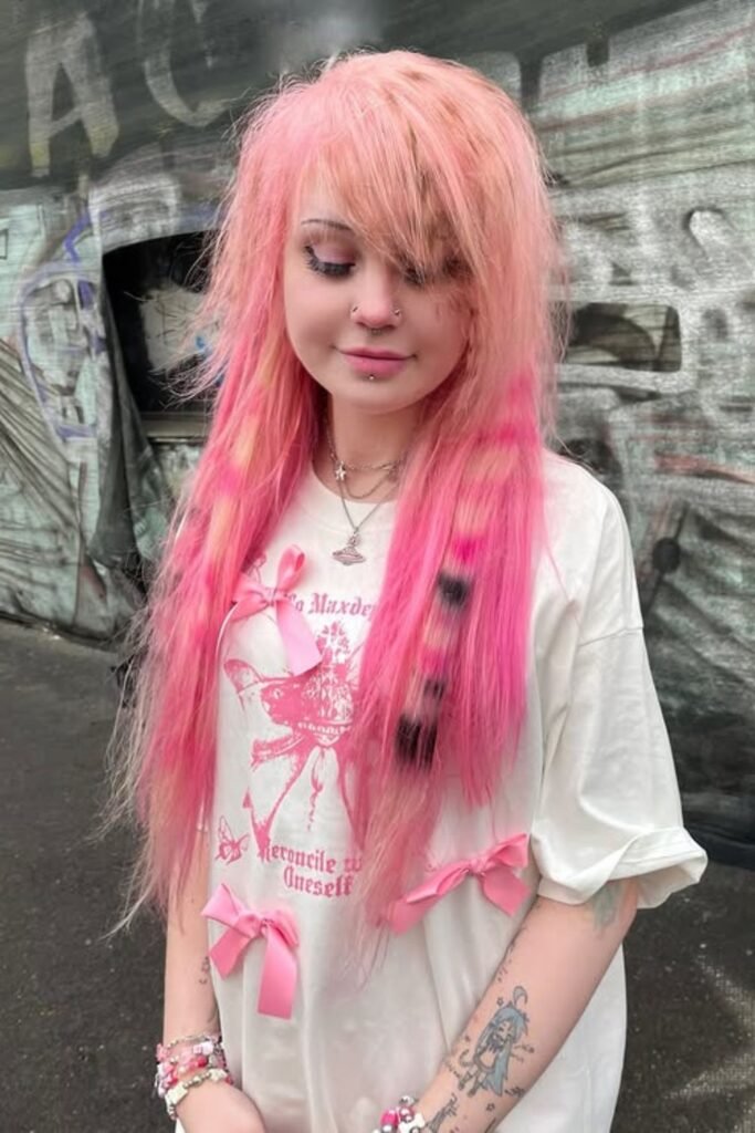 Long pastel-pink hair gains instant emo character from the soft striping near the bottom, which adds depth without cutting away length.