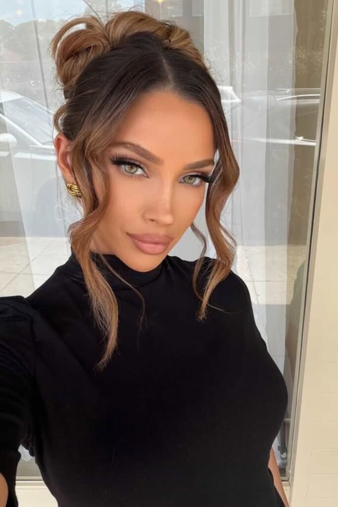 Attention turns upward after the bun sits high and tidy. Smooth the front and sides with a flat iron so the base looks sharp, then gather hair tightly before covering the bun.