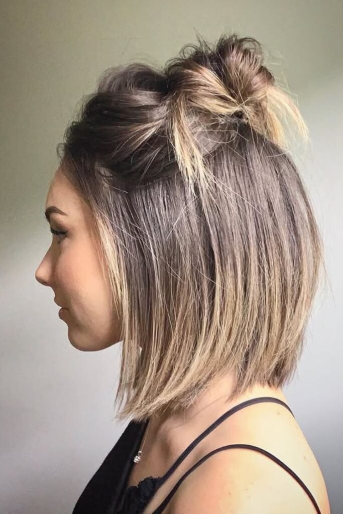 Short hair gets instant lift once the crown goes up. Smooth the front lightly with a flat iron, then gather.