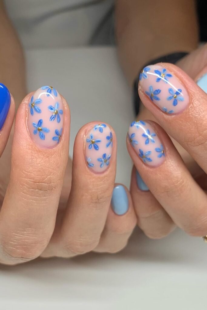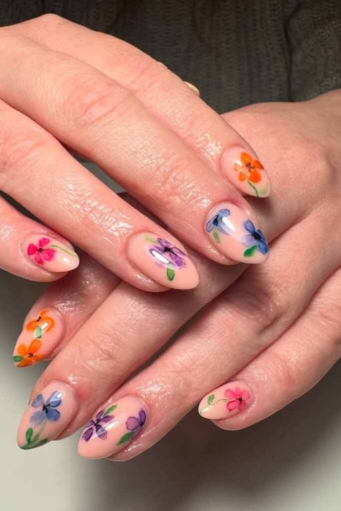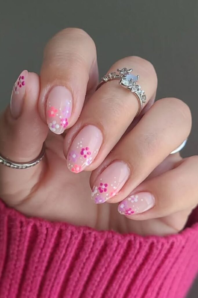 To make it again, start with a nude or sheer pink base. Then, paint little flowers in different colors, such as orange, purple, and blue.