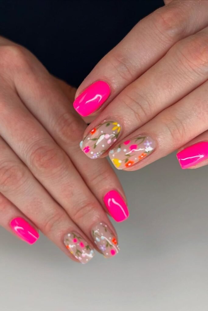 Bright pink nails instantly grab attention, and the floral accent nails keep them from feeling too bold.