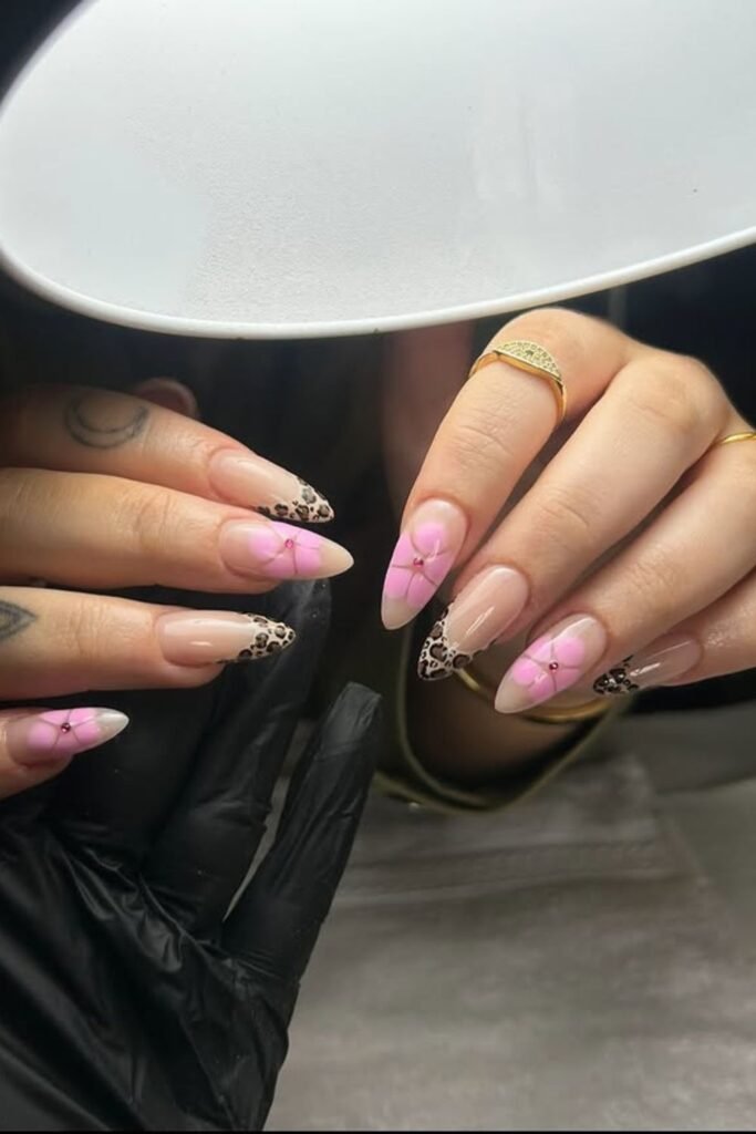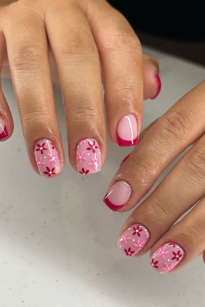 Bold pink tips meet playful blossoms for a design that feels both sweet and modern.
