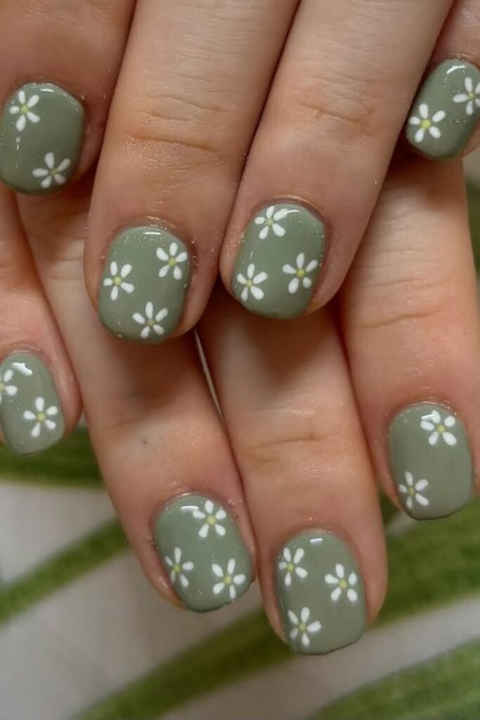 Muted green polish and tiny white daisies make this design calm yet eye-catching ideal for everyday wear or a cozy weekend look.