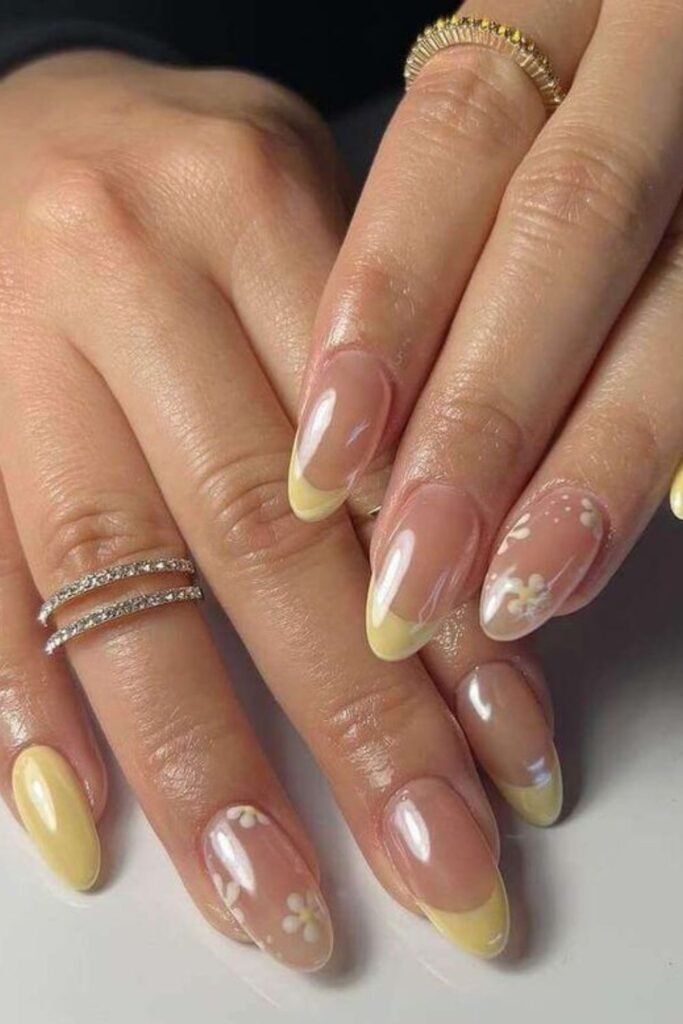 Use a transparent or nude base and paint thin yellow French tips to make it again. Next, use a dotting tool to put little white flowers near the cuticle or edges.