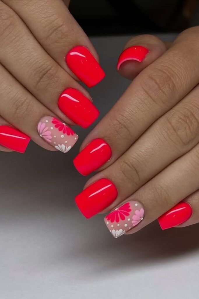 Vibrant coral nails bring instant energy, and the floral accent nails add the perfect feminine touch.