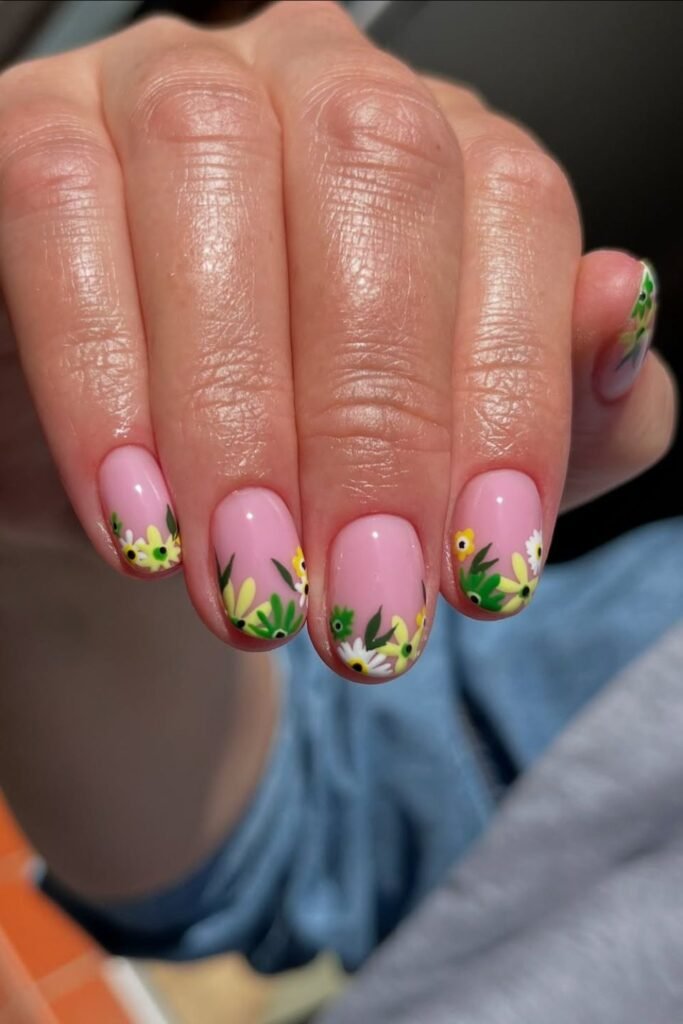 To make this look, paint your nails light pink and then paint clusters of yellow, white, and green flowers on the tips.