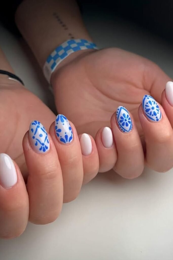Royal blue detailing on crisp white nails gives a classy, porcelain-inspired effect that feels timeless and elegant.