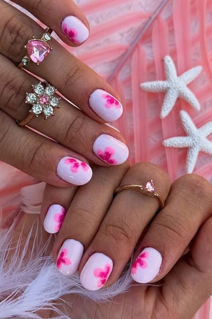 Soft white-pink nails with bold magenta petals give a fresh, tropical touch that instantly brightens your look.
