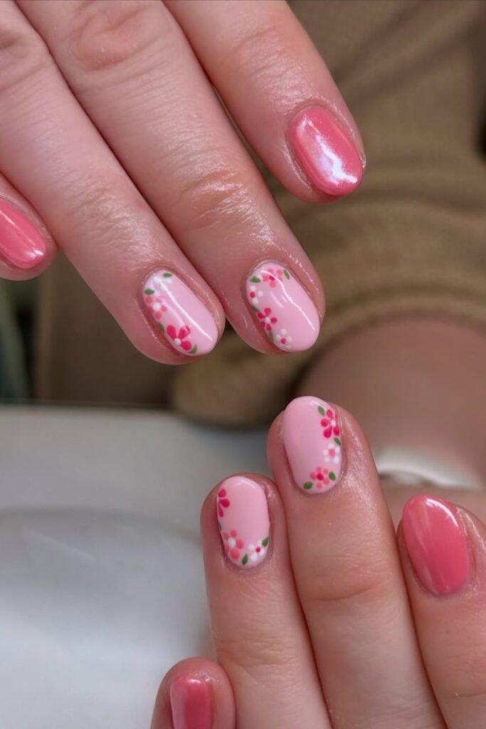 A soft pink base framed with tiny floral details gives a sweet, romantic vibe that’s perfect for brunches, spring weddings, or date nights.