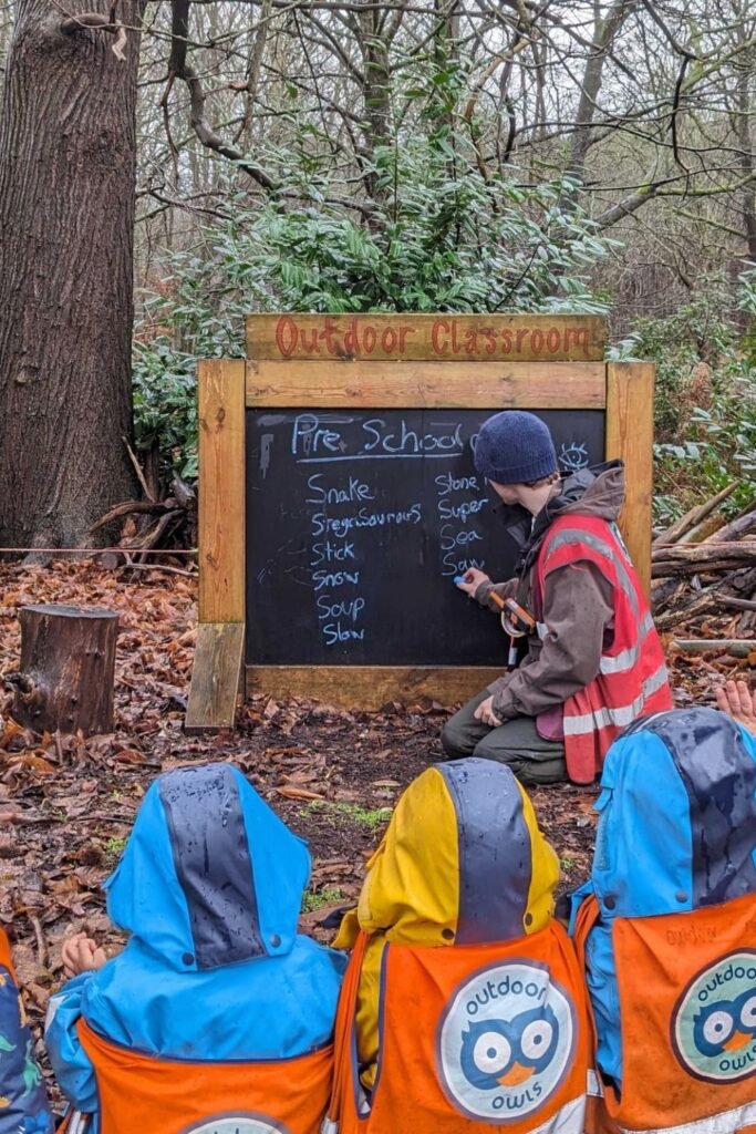 Set up a simple chalkboard between trees or use a portable board in a woodland corner. Keep lessons short and interactive.