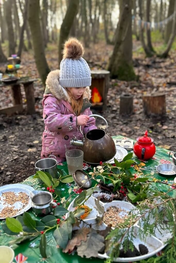 Magic happens around a tiny woodland “kitchen.” A kettle, a few metal cups, scattered leaves and pinecones suddenly you’ve got a five-star forest café.