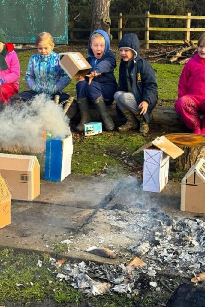 Big reactions make big memories. Cardboard houses, smoke rising, wide eyes watching it all unfold suddenly learning feels exciting instead of forced.