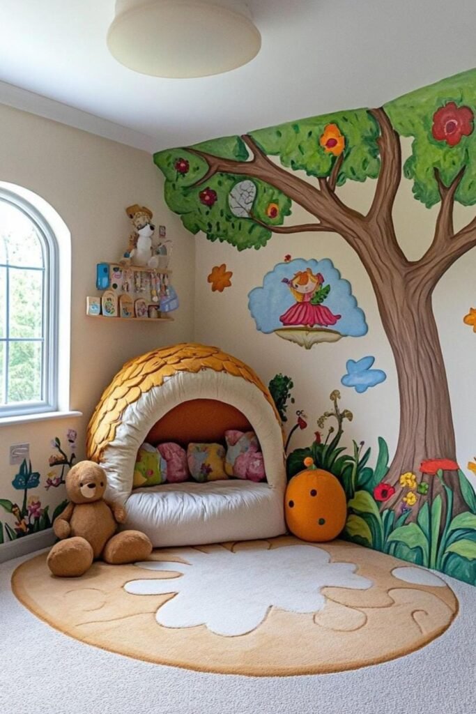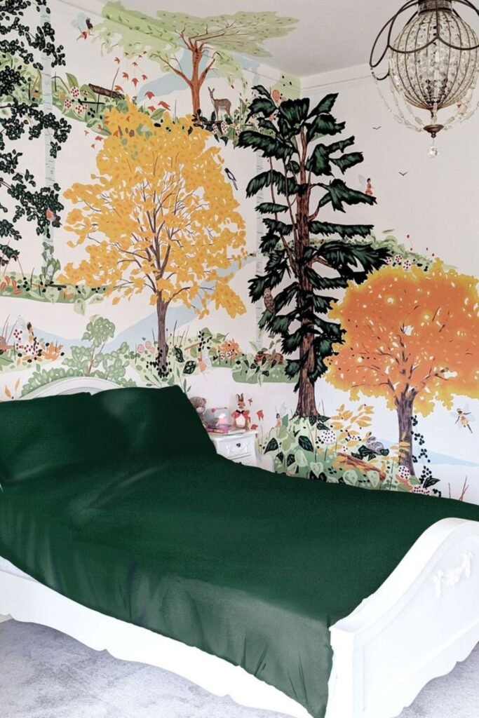Autumn-colored trees bring warmth into kids’ bedrooms without making the space feel busy. Hand-painted or mural-style walls work best.