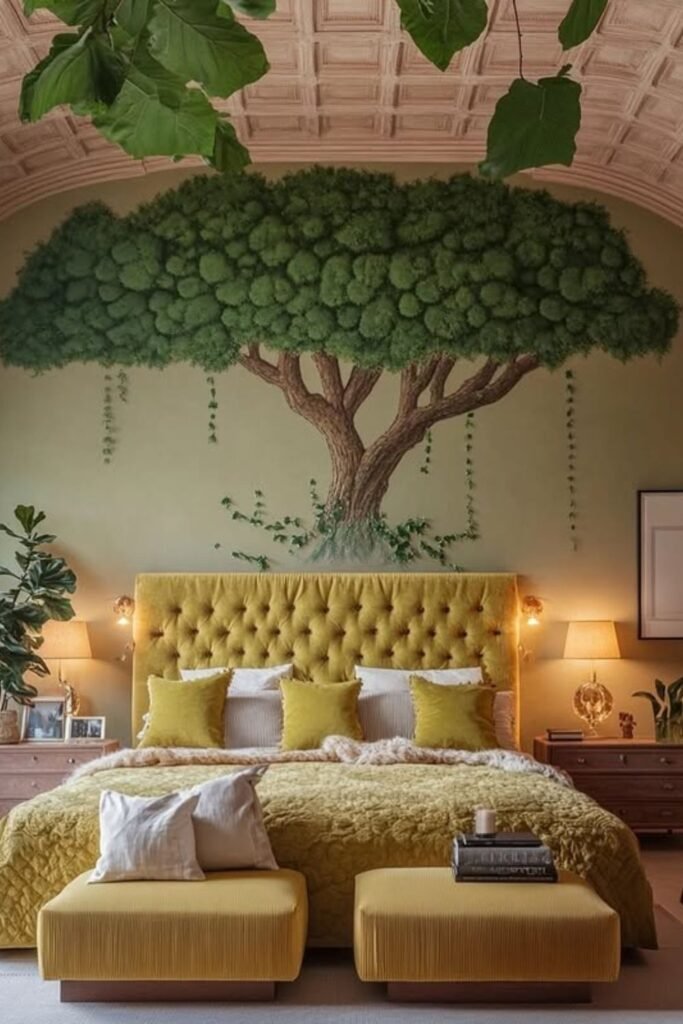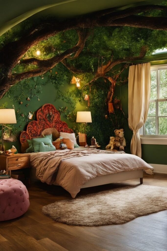 Forest magic feels believable when the wall becomes part of the story. A painted or mural-style tree behind the bed works best in calm bedrooms.