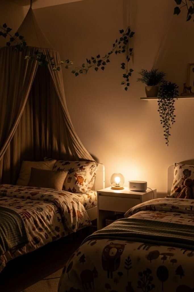 Forest bedrooms aren’t only visual. Soft background sounds like gentle rain or wind-through-trees help kids relax at night.