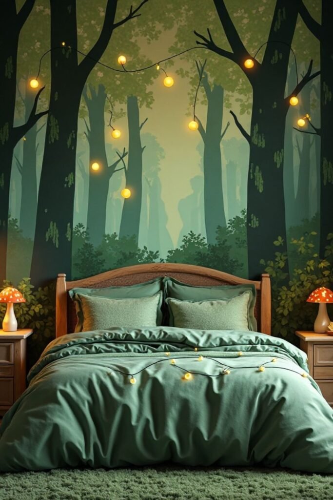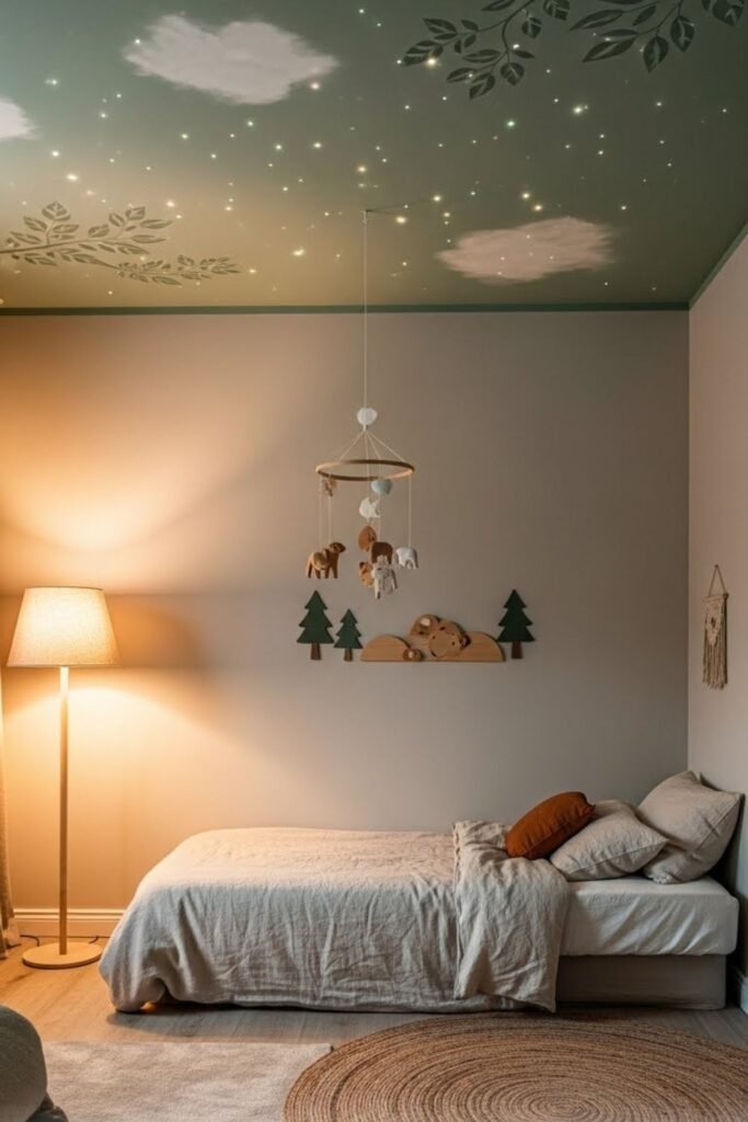 Ceilings rarely get attention, which makes them perfect for subtle forest details. A soft sky-green wash, faint leaf stencils, or tiny glow dots can shift the mood.
