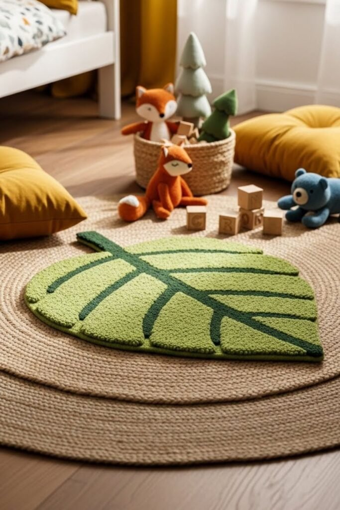 Rugs can guide how a room feels underfoot. Layering textures like a leaf-shaped rug over a flat neutral one creates a forest path effect kids love.