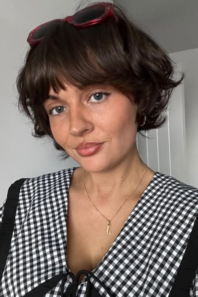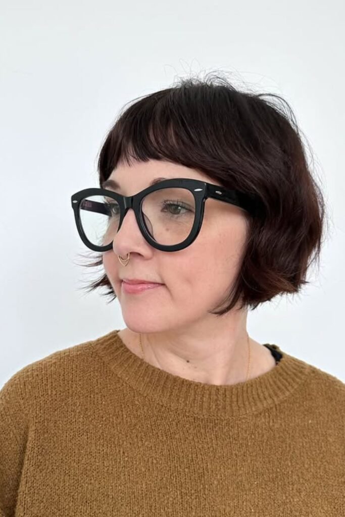 Frames usually fight with bangs, but this cut makes room for them. The fringe sits just above the brows so it doesn’t crash into glasses.