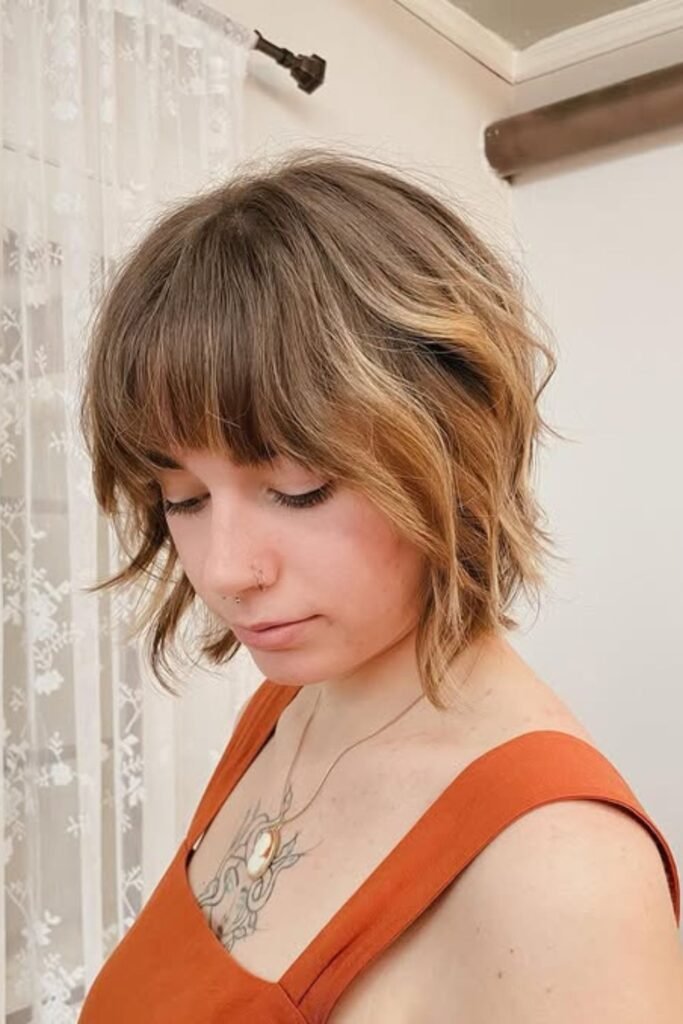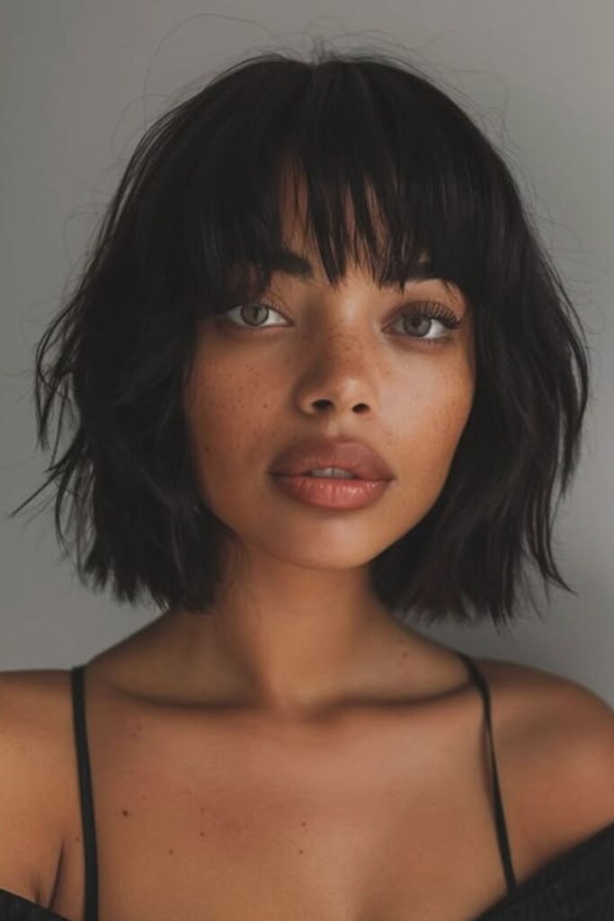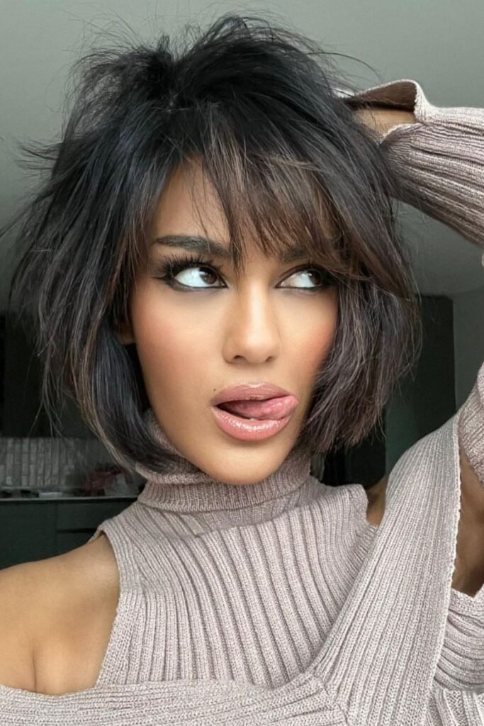 Choppy ends prevent the bob from drooping, while short, wispy micro bangs leave the forehead feeling open, not weighed down.