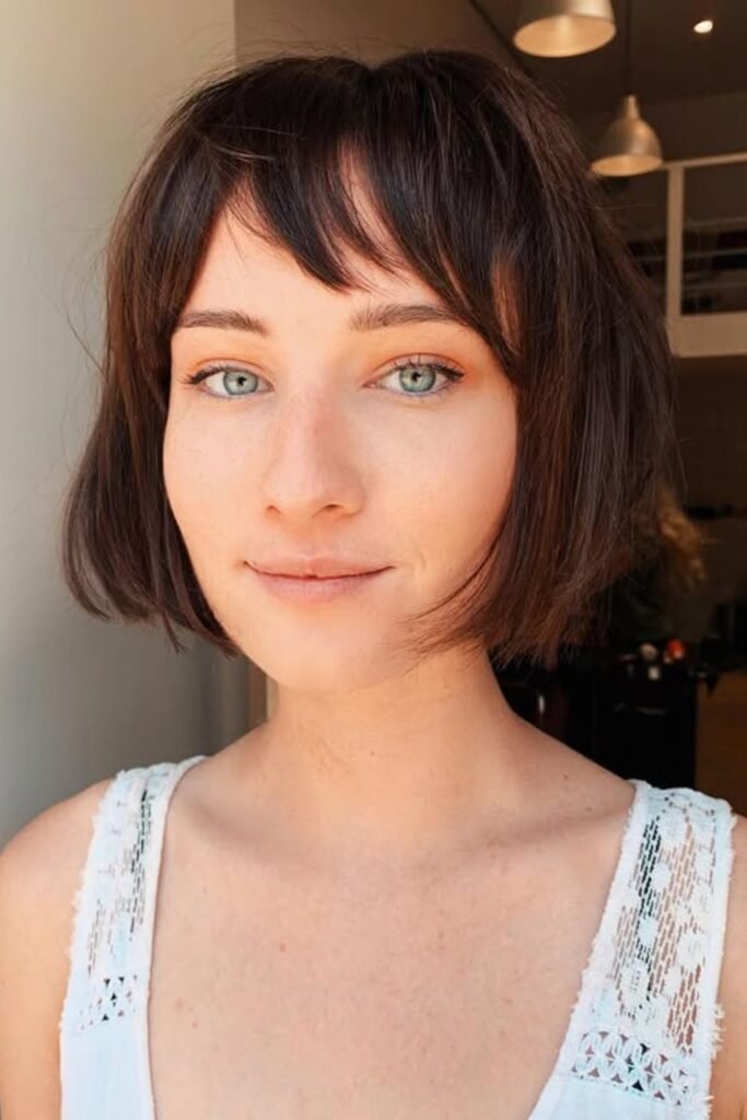 Short bangs can gently frame the forehead and offering a softer look without dominating the face. This style is ideal for those seeking a departure from sleek and straight hair.