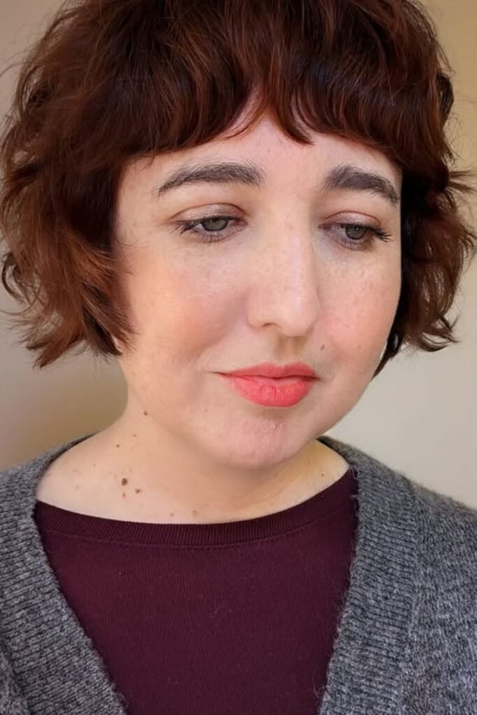 Short bangs change the whole mood here. They pull focus upward, which balances out fuller cheeks and keeps curls from crowding the face.