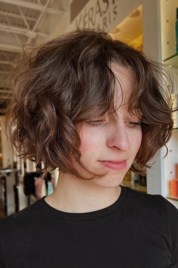 Curls don’t need strict lines to look intentional and this cut proves it. The rounded bob keeps volume controlled.