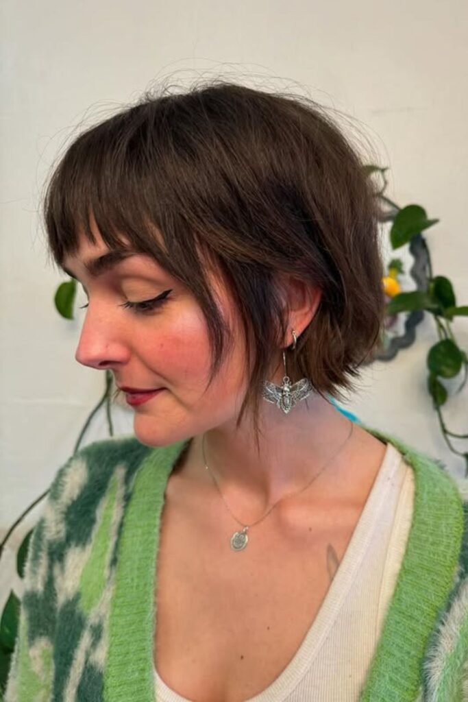 Messy bangs usually scare people, but here they actually make life easier. The fringe breaks up the forehead without sitting heavy.