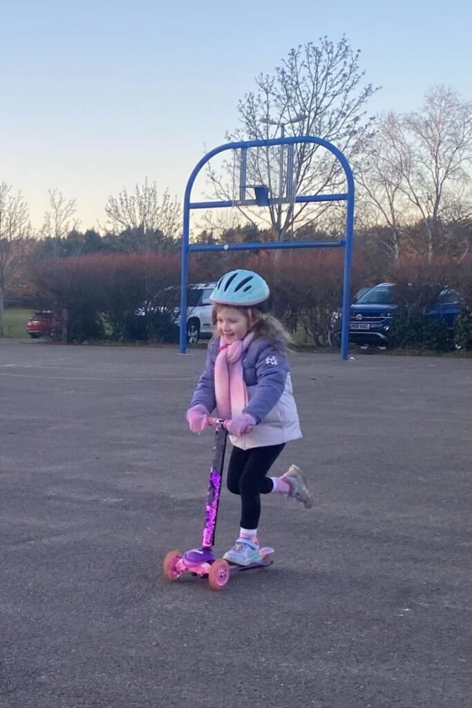Forward motion keeps restless bodies regulated. Open paved spaces like driveways or quiet courts give kids room to push, glide and turn without stopping every second.