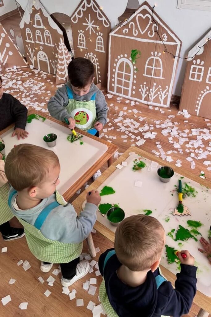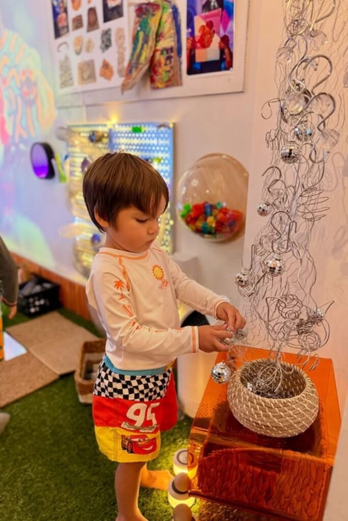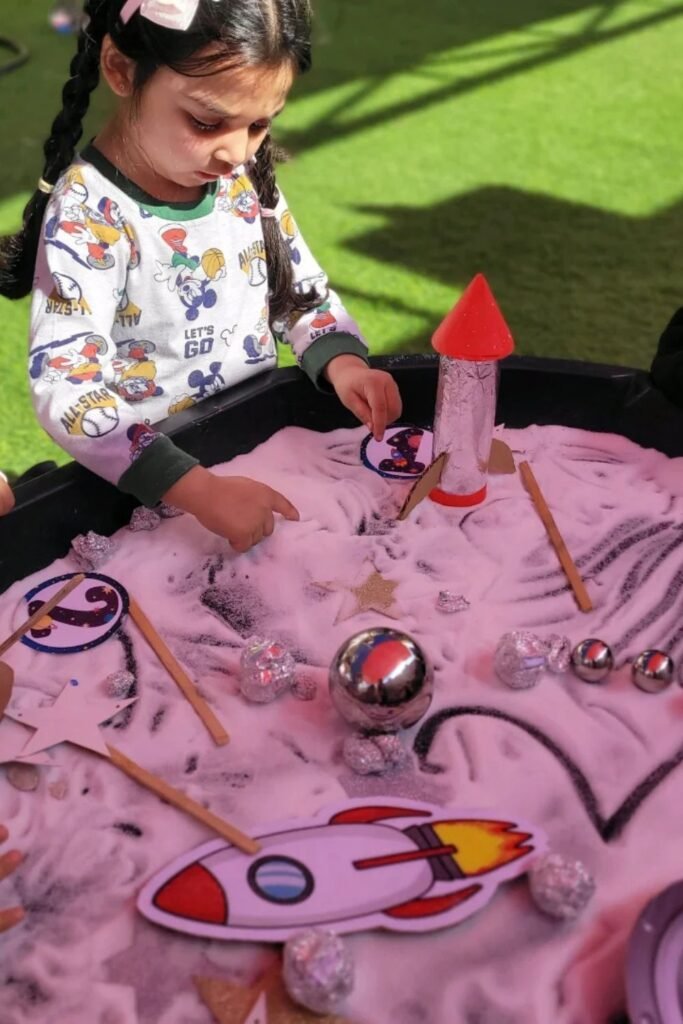 Fine motor play feels easier when imagination leads. A low table filled with colored sand, foil balls and small themed cutouts pulls kids into slow, careful movement.
