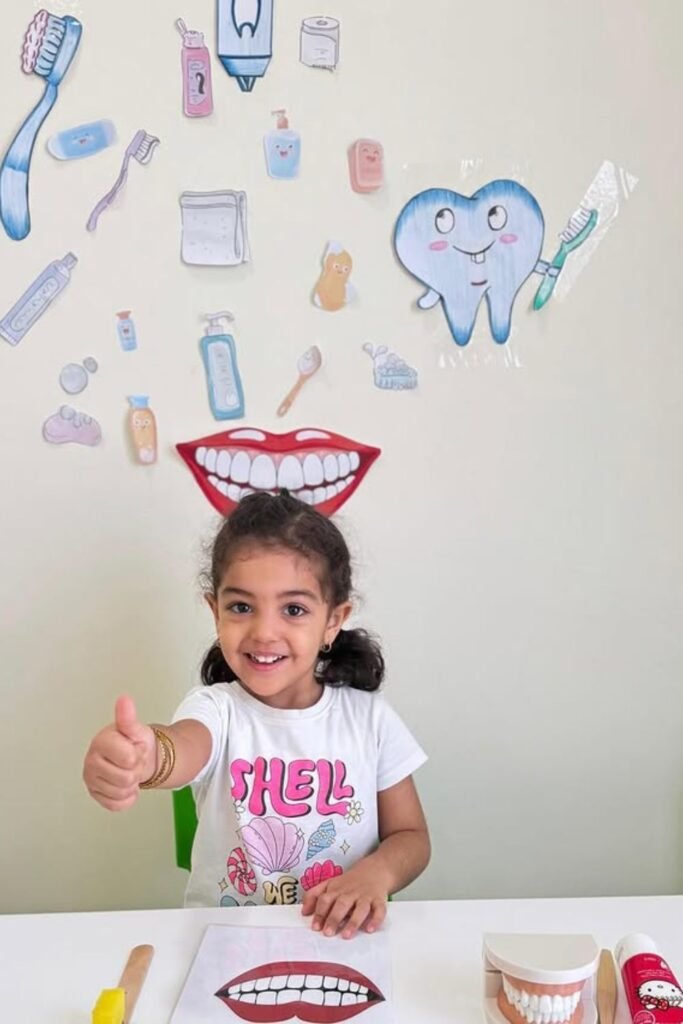 Brushing becomes a fun game not a dreaded task. The pictures on the wall do all the explain without any fuss.