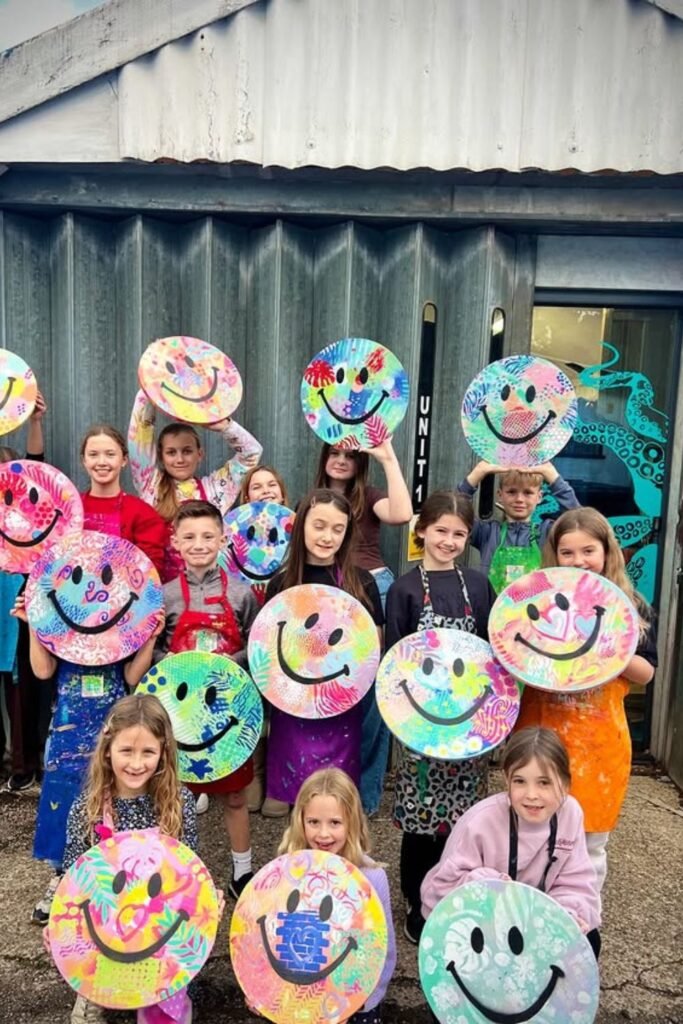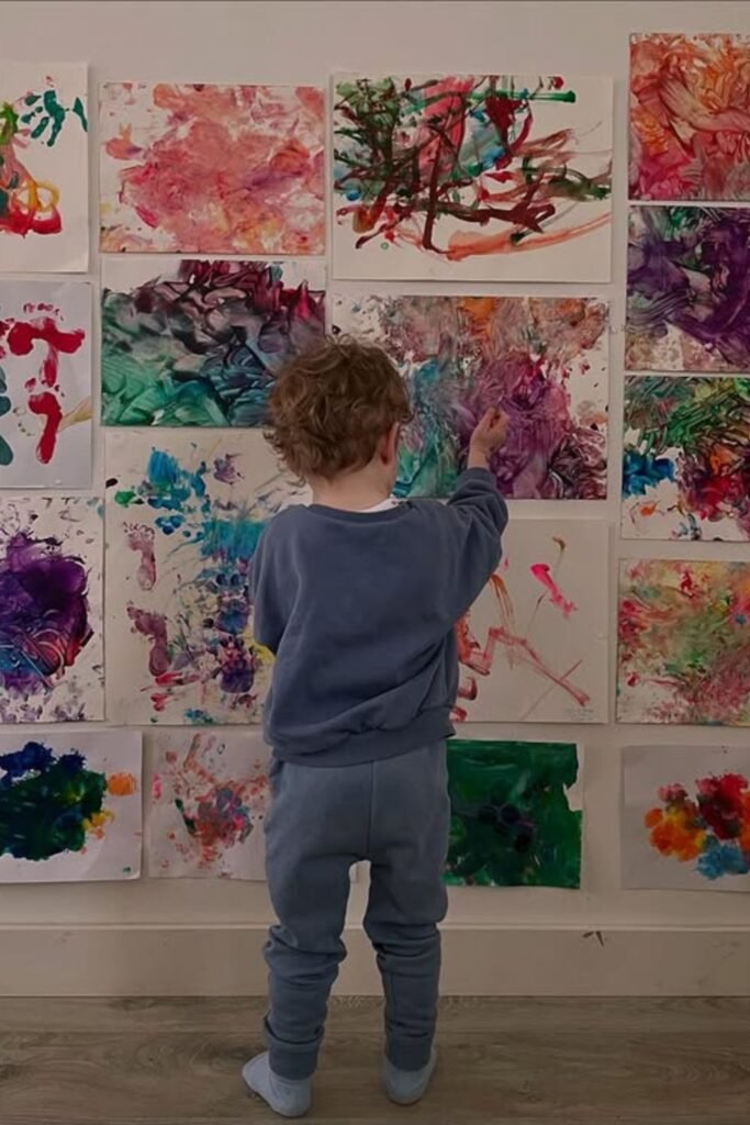 Controlled mess feels different from chaos. Cover the living room floor with paper, set low tables in the center and let paint or textured tools do the work.