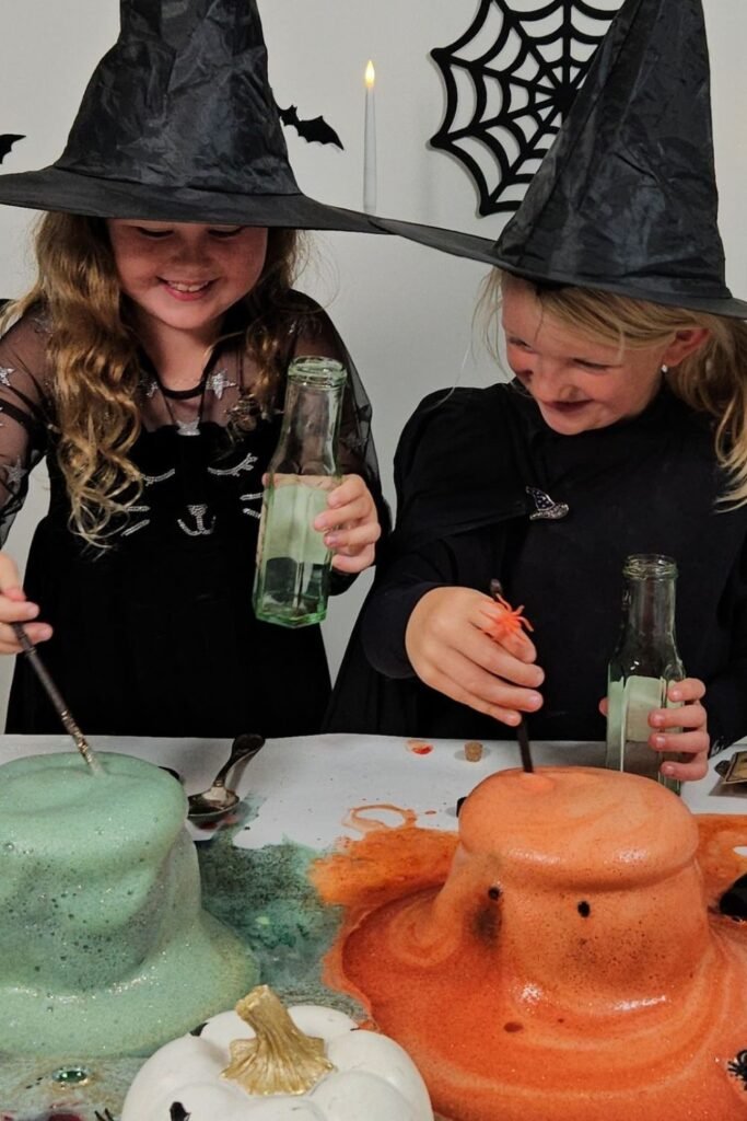 Excitement rises the moment foam starts spilling over. A sturdy living room table or outdoor setup works best for colorful fizzing experiments like this.