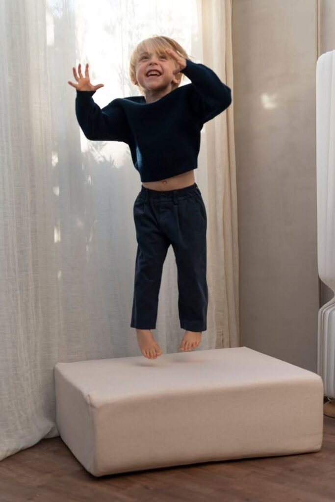 Energy spills out fast when kids get a safe place to land. A firm floor cushion near the living room window.