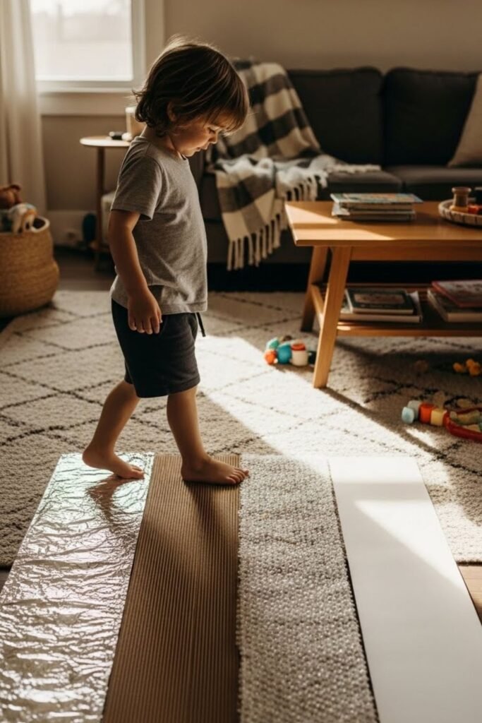 Noise becomes interesting when kids control it. Lay different objects across the living room floor foil, cardboard, fabric, bubble wrap and let bare feet test each step.