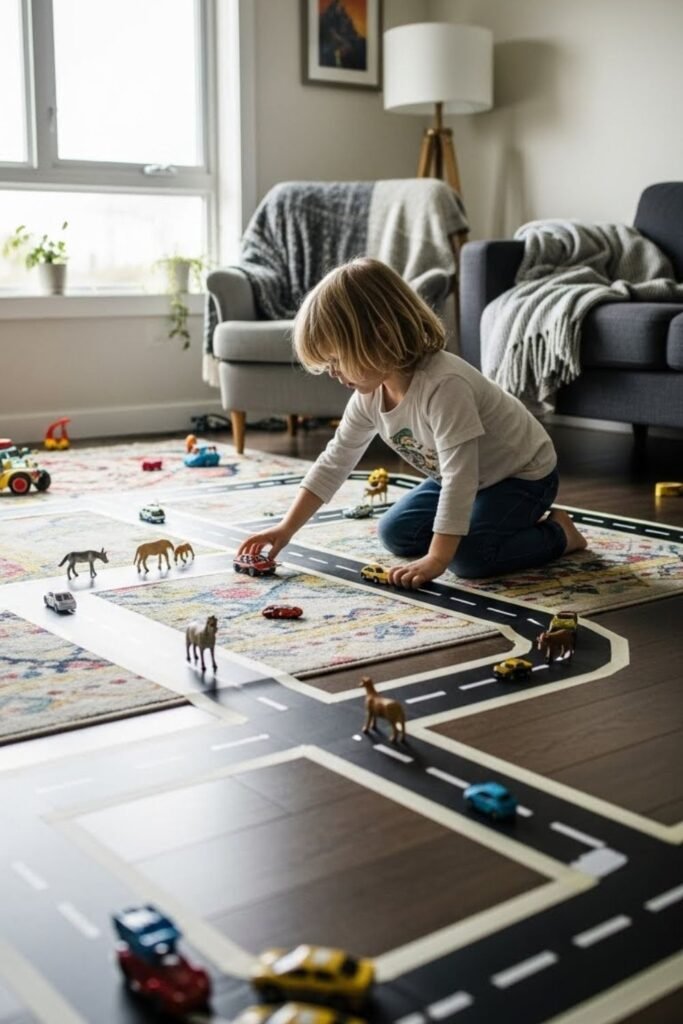 Imagination flows better when movement stays small. Tape simple lines across the living room floor using painter’s tape.