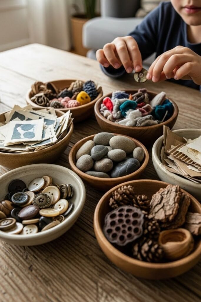 Hands calm down when they are busy comparing. Fill small bowls with mixed items like buttons, fabric scraps smooth stones and paper bits.