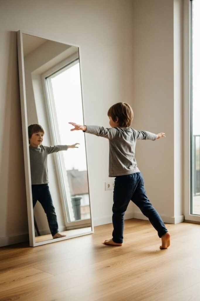 Body awareness grows when kids can see themselves. Lean a safe mirror against the living room wall.