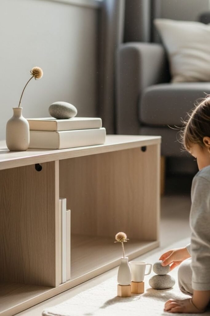 Soft light and open floor space change how kids settle in. A round rug in the living room naturally invites sitting, sorting and quiet play without being told.
