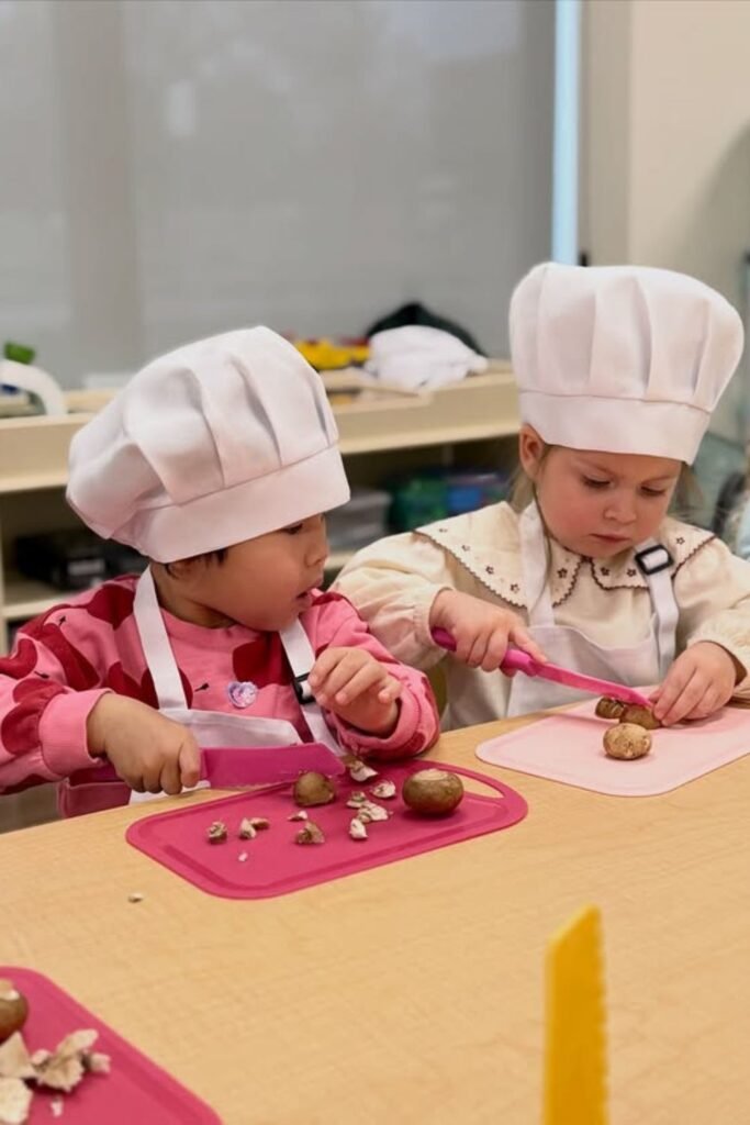 Little hands love real tools. A low table in the living room or dining corner becomes a prep station with soft foods, kid-safe knives and small boards.