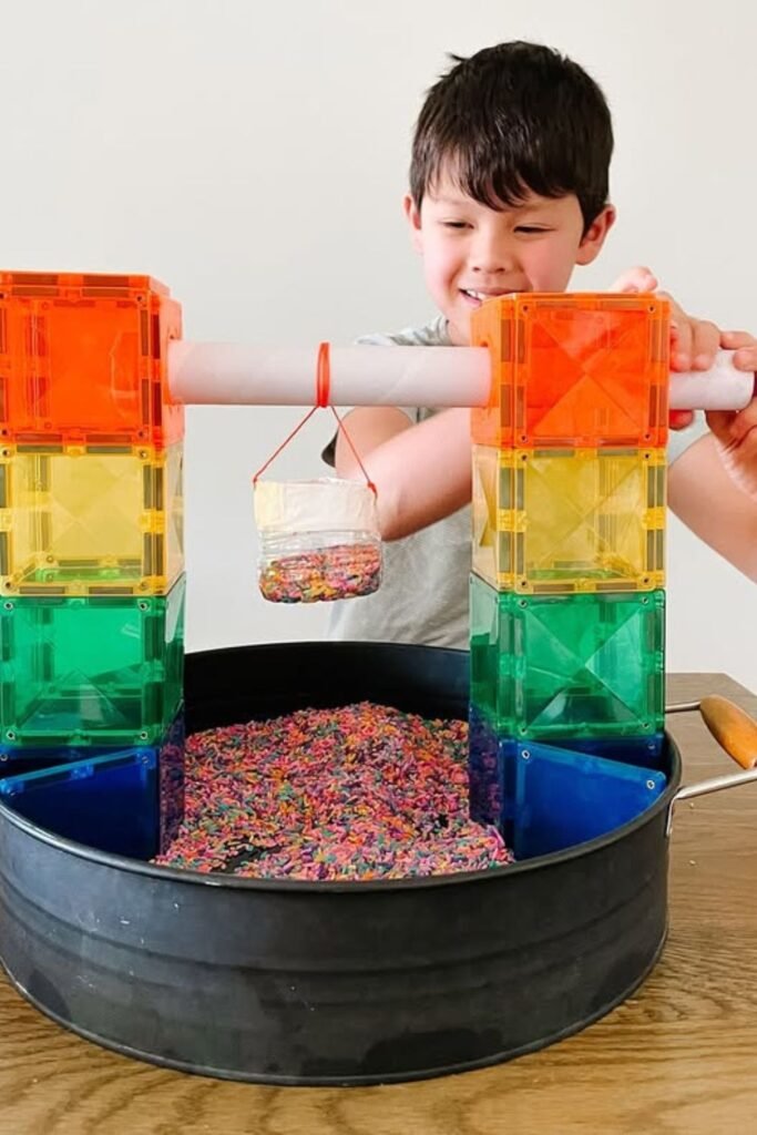 Curiosity kicks in as soon as kids see something hanging and moving. Set this up on a living room table using magnetic tiles.