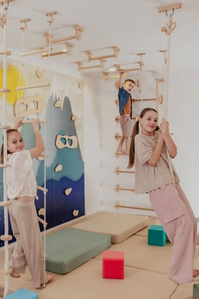Muscles switch on the moment kids grab ropes and bars. A padded living room corner with wall grips, hanging ropes or a small climbing frame.