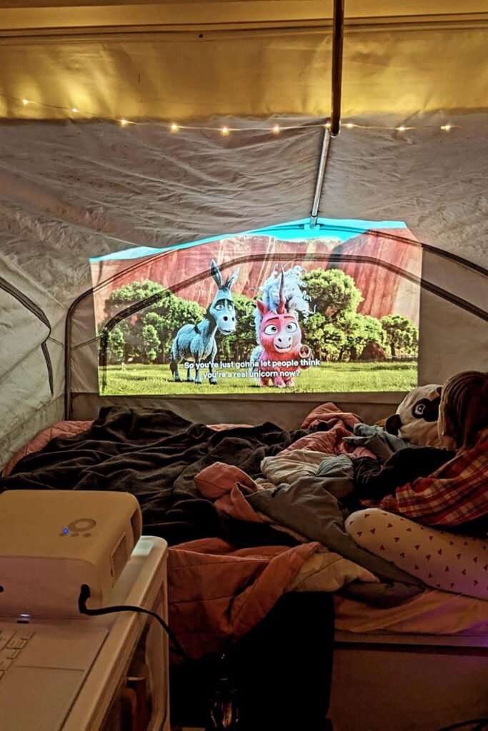 Turn movie night into an experience instead of just pressing play. Set up a small projector, hang a sheet or use a tent wall.