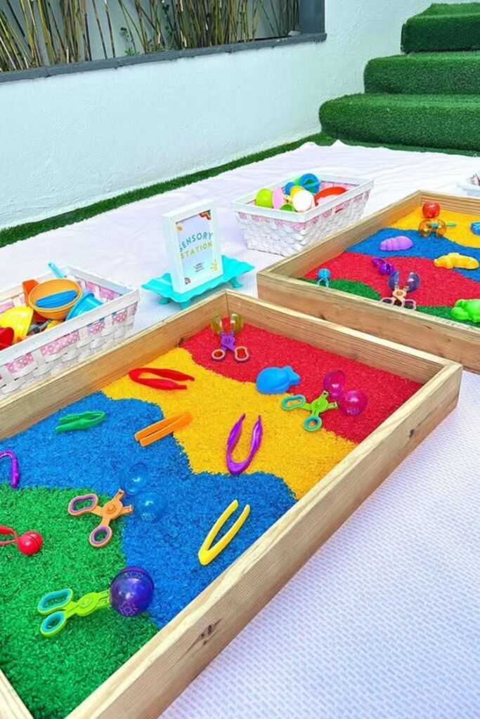 Colorful textures pull kids in without you saying a word. Fill shallow wooden trays or plastic bins with dyed rice, kinetic sand, or small beans, then scatter scoops, cups, tweezers.