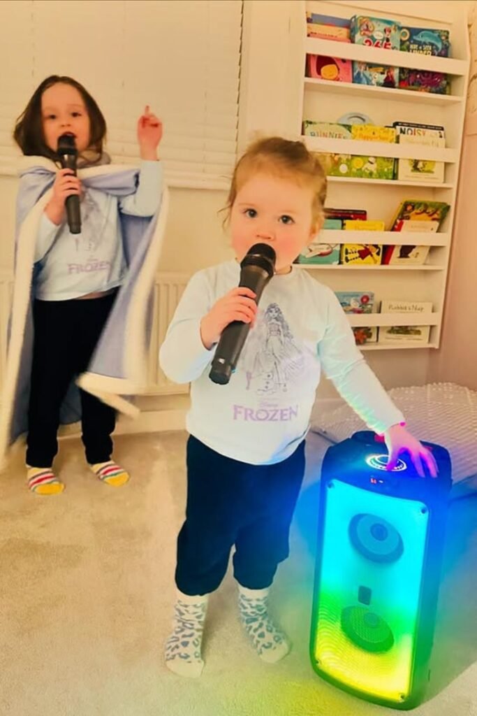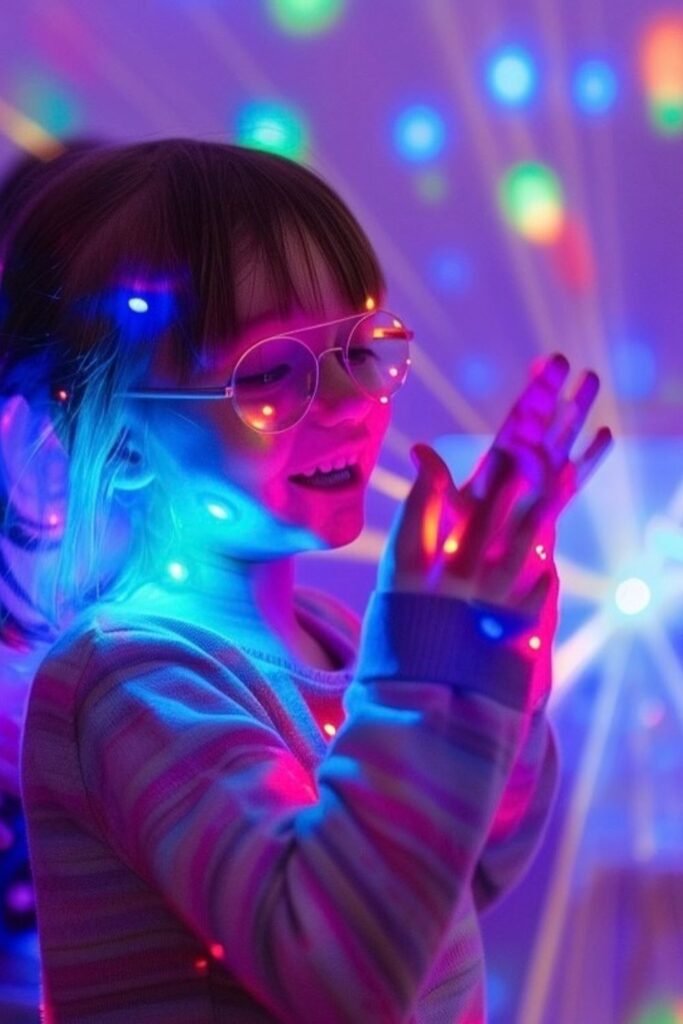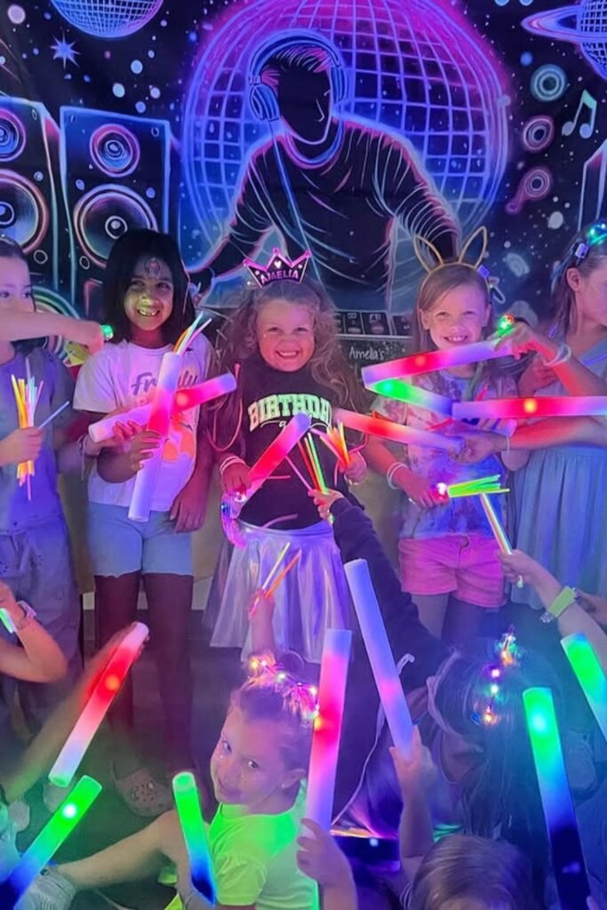 Lights down, music up, and suddenly the whole room feels electric. Grab a small disco light or projector, clear some space, and let kids move however they want.