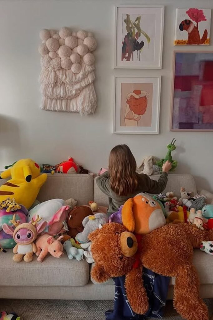 Pile every stuffed animal in one spot and watch imagination take over. Turn the couch or floor into a “stage” and let kids create a parade.