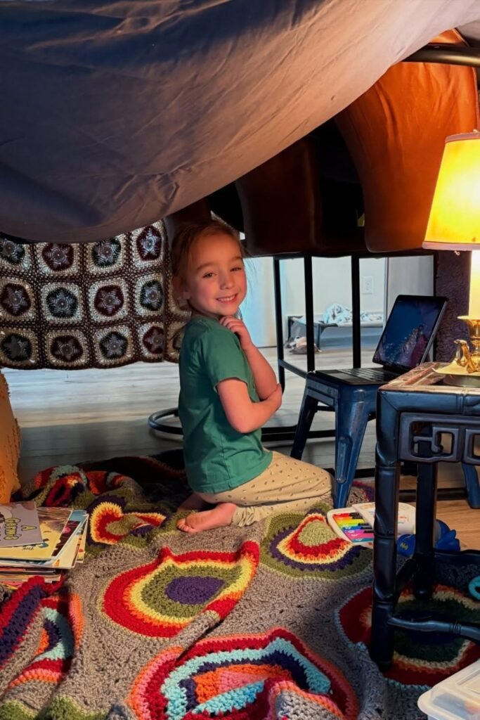 Nothing beats the magic of crawling into your own little world. Push chairs together, drape blankets over the top, and build a cozy hideout right in the living room.