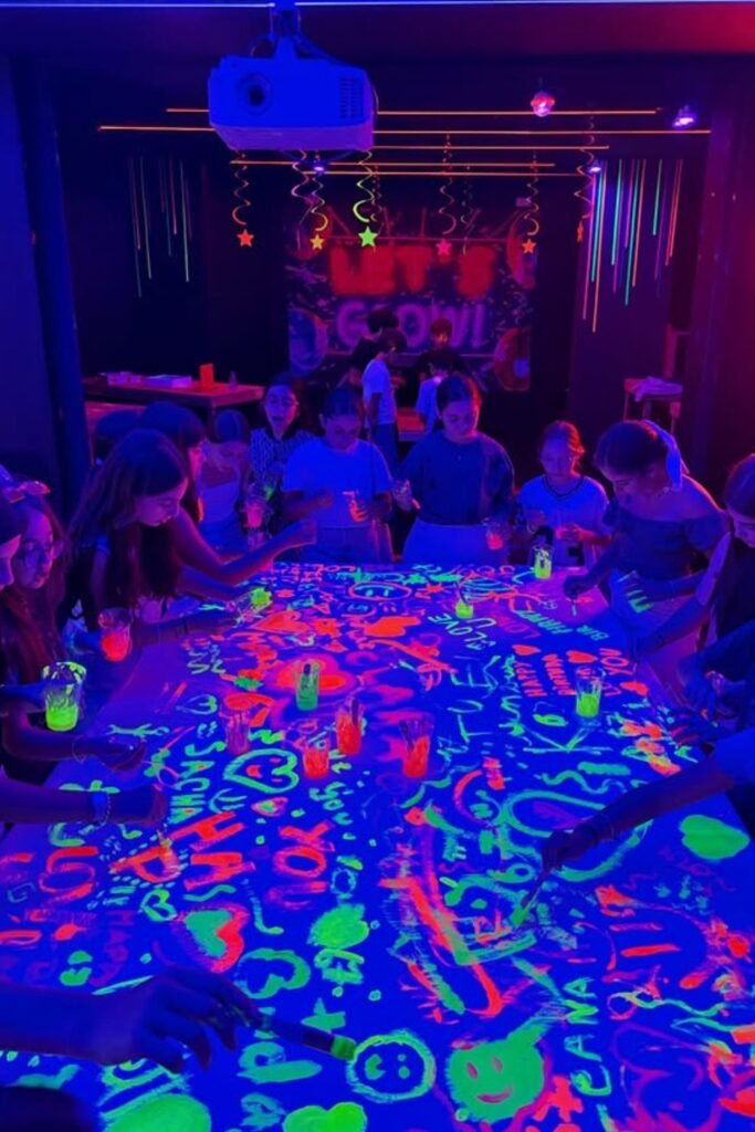 And put a big piece of paper or plastic table cover over a table. Give everyone glow or neon paints and let them go crazy with names, doodles.